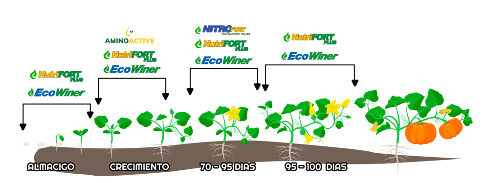 El plan nutricional de Agross para cucurbitáceas —como melón, sandía, zapallo y zucchini— está diseñado para cubrir las altas demandas nutricionales de estos cultivos, promoviendo una planta equilibrada, productiva y con frutos de excelente calidad comercial. En la implantación, se aplican nutrientes clave como nitrógeno, fósforo y zinc en formas rápidamente asimilables, que favorecen la emergencia pareja, el desarrollo radicular y una estructura vegetativa sólida desde etapas tempranas. Durante la floración y fructificación, el plan incorpora aplicaciones foliares de potasio, boro y aminoácidos, fundamentales para asegurar una buena formación floral, mejorar el cuajado y favorecer el llenado uniforme del fruto.
